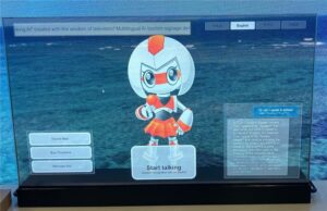 上部につけたカメラがOLEDの前に立つ人を感知すると画面が遷移し、オーバーツーリズム対策のソリューションとして構築された、対話型AIの「メグリア」を投影。